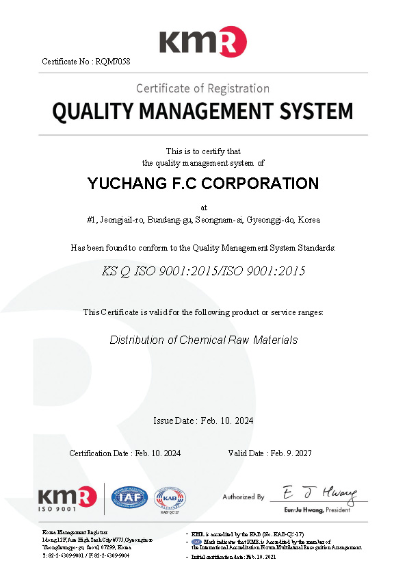 ㈜유창FC는 정밀화학산업의 발전과 더불어 성장해온 종합화학제품을 취급하는 회사로서 당사의 최종제품을 판매에 있어 제품에 적용되는 국내법, 고객 요구조건 및 품질경영시스템 매뉴얼에서 규정하는 모든 요구 조건을 준수해야 할 책임이 있음을 항상 인식하고 있다.